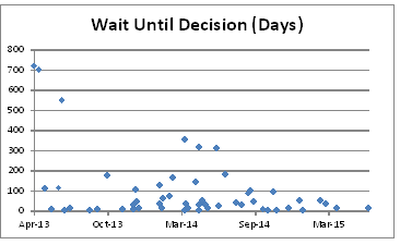 For clients who have been interviewed and have received decisions, wait times vary widely. The median wait time for 2013 and 2014 cases was 34 days – but ranged up to 719 days (and keep in mind that this does not include data from people who have been interviewed and who are currently waiting for a decision). The following chart shows the wait time until a decision was made, by interview date: