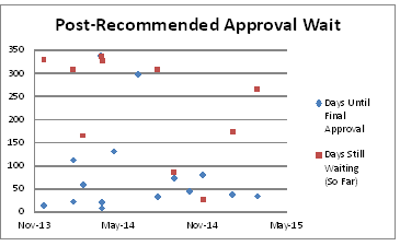 Lastly, let’s look at recommended approvals. Recommended approvals are issued in cases where the Asylum Office is convinced that a case meets the standard for asylum, but the background check is not yet complete. People with recommended approvals can apply for employment authorization, but cannot sponsor their family members who are waiting to join them in the U.S. The following chart shows how long our clients have waited from the date of the recommended approval to the date of the final decision (never mind how long they might have already waited to get the recommended approval). Information about people who have received recommended approvals and who are still waiting for their final decisions are also shown in the same chart: