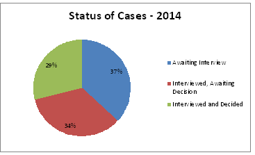 Looking at data from 136 of our cases—filed in 2013 and 2014 in the Arlington, Virginia Asylum Office—we can see that about one-third of the cases have been interviewed but are still awaiting decisions. The charts below compare cases filed in 2013 with cases filed in 2014: